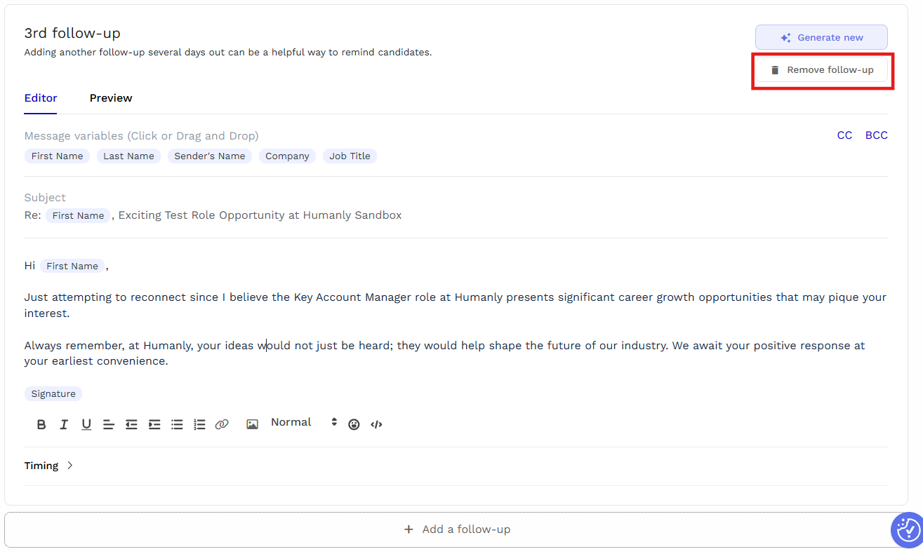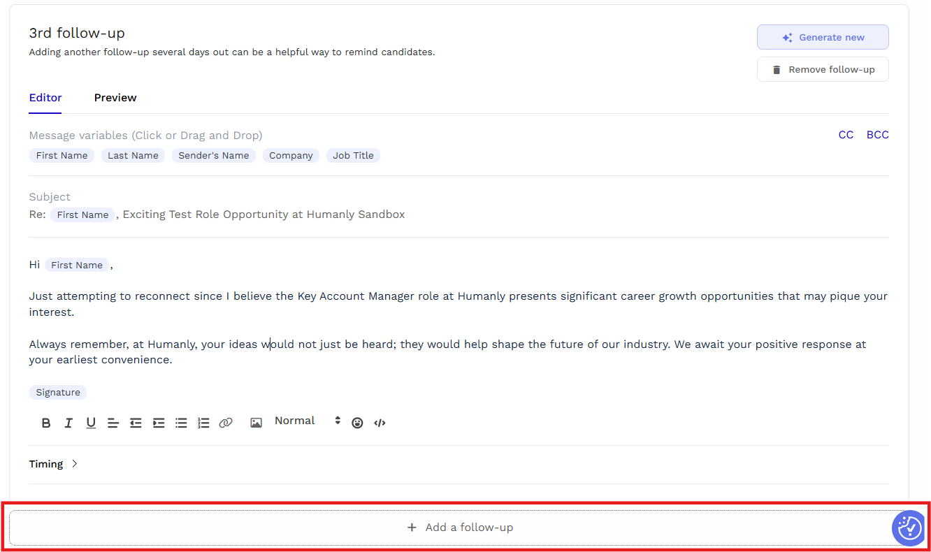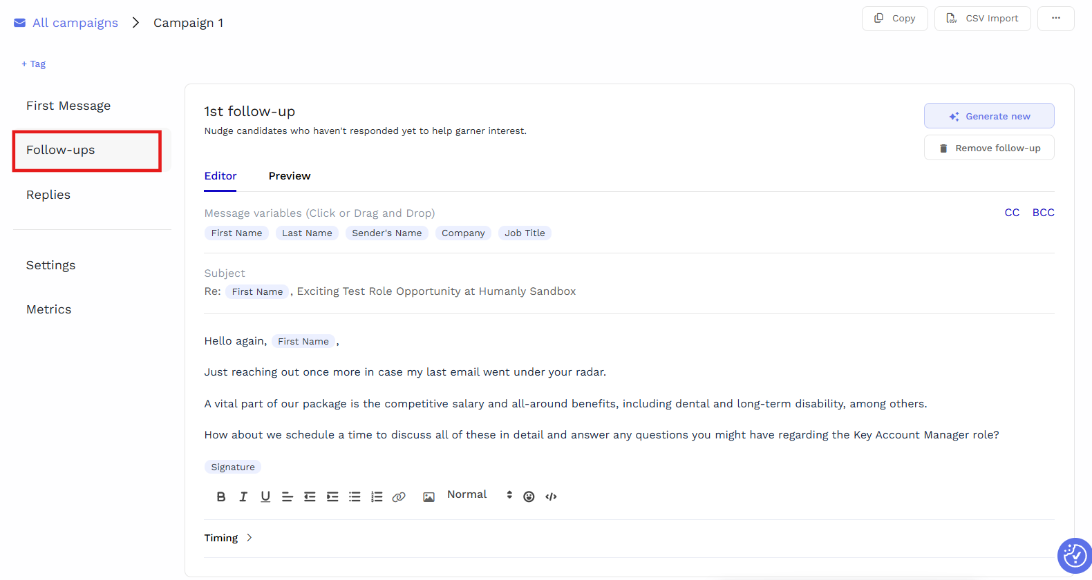 Please note that changing the follow-ups within the sourcing modal will change the messaging for all selected candidates but will not change the messaging for the campaign overall.