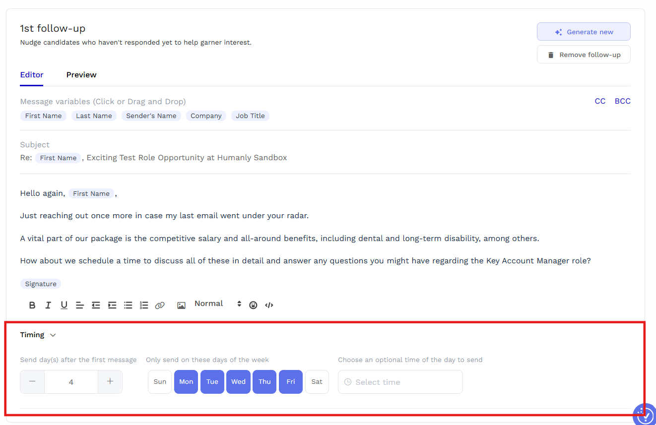 Once you’ve created an Outbound Campaign, you can manage and edit your follow-up messages. Follow-up messages will reach the candidate when the candidate does not respond to the First Message or the previous follow-up.