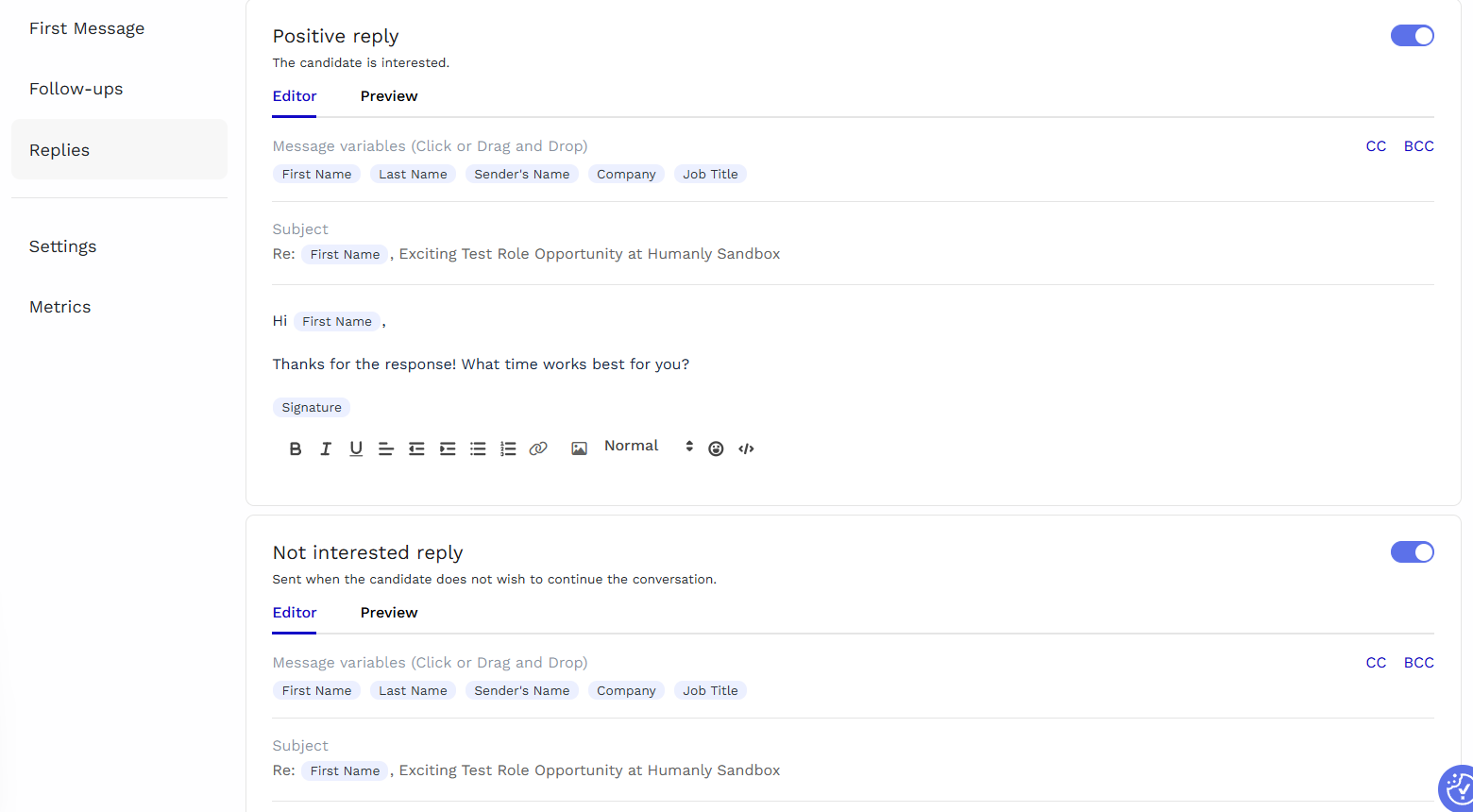 Replies can be edited and toggled on or off within the sourcing slideout. To edit the reply messaging, select which reply you would like to edit and change the text inside the messaging. Humanly will automatically save changes for the candidate(s) selected.