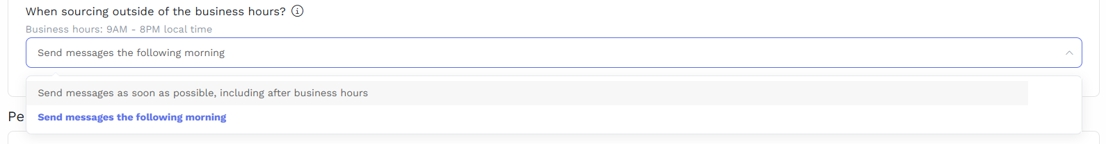 Step 2. Scroll down to "When sourcing outside of the business hours?" section, select the drop-down menu and choose the option "Send messages as soon as possible, including after business hours".